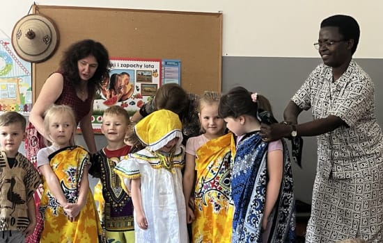 24 czerwca nasze przedszkole odwiedziły Siostry Misjonarki NMP Królowej Afryki. Dzieci z grupy ,,Motylki” i ,,Słoneczka” poznały Siostrę Agnieszkę z Polski oraz Siostrę Lucy z Ugandy. Siostry pokazały dzieciom wykonane ręcznie zabawki przywiezione z Afryki, instrumenty muzyczne oraz stroje, które można było przymierzyć. Siostra Lucy nauczyła nas afrykańskiej piosenki i tańca. Dzieci świetnie się bawiły przy afrykańskich rytmach.