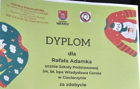 Rafała Adamek , uczeń klasy 2 Szkoły Podstawowej w Ciecierzynie zdobył w konkursie I miejsce w kategorii uczniów klas II i III Szkół Podstawowych z terenu Gminy Niemce.